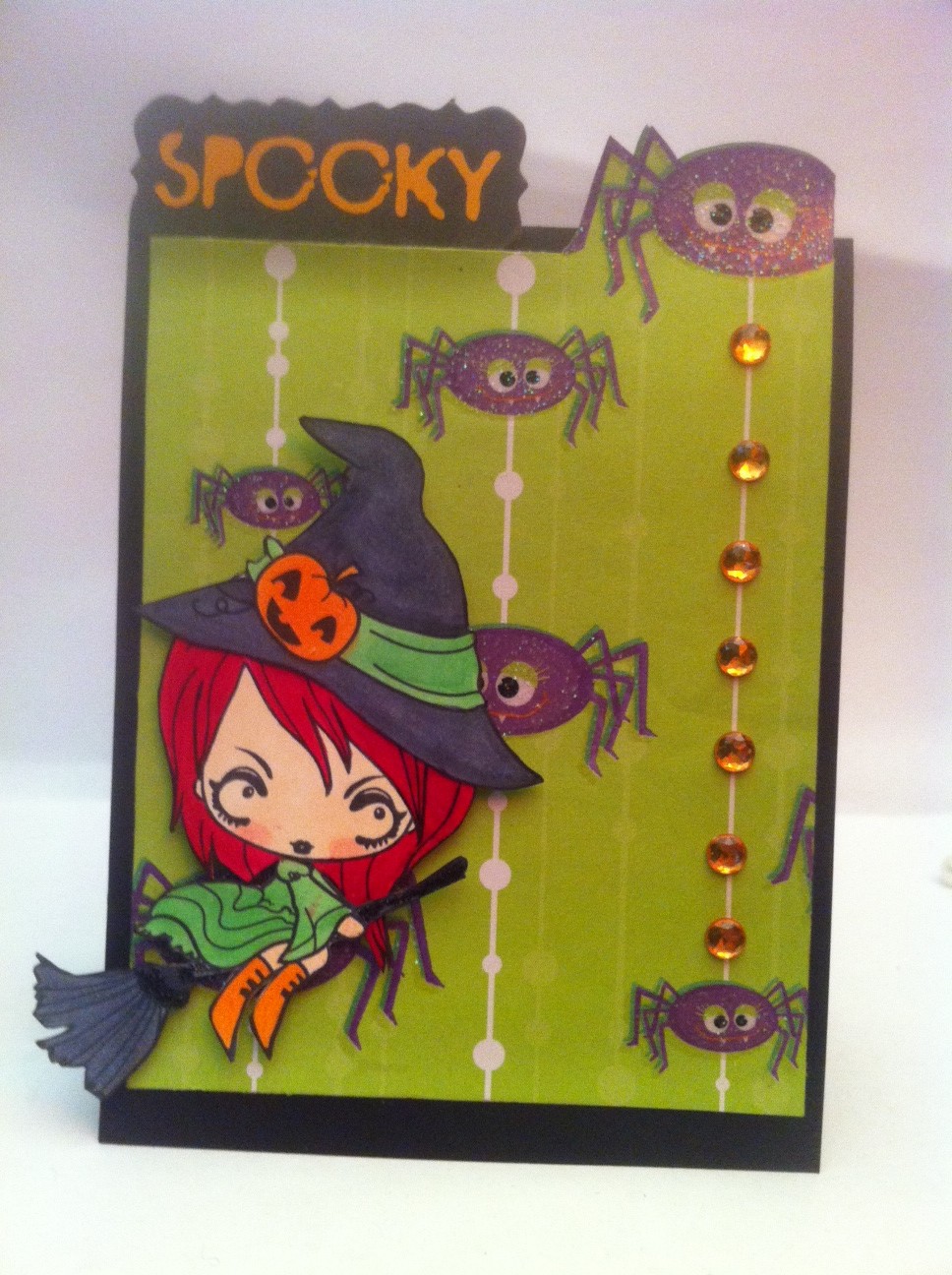 I am having so much seeing everyone Halloween cards!! Yours is so stinkin cute!! Love what you did with the spiders and the gems and your cute little witch is perfectly colored.